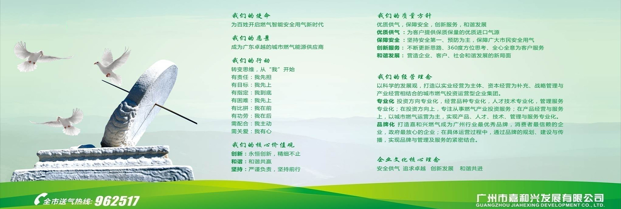——廣州市嘉和興發(fā)展有限公司于2001年3月1日注冊成立,主要從事瓶裝液化石油氣(LPG)批發(fā)貿(mào)易,民用、工業(yè)用液化石油氣,工業(yè)用氣體,汽車加氣站及危險(xiǎn)品物流運(yùn)輸?shù)?,總部設(shè)在廣州。目前公司經(jīng)營三個(gè)液化氣充裝站、一個(gè)汽車加氣站:白云區(qū)神山達(dá)嶺液化石油氣站、白云區(qū)加禾氣站和佛山市南海區(qū)冠順氣站,黃埔區(qū)塘口汽車加氣站,總庫容接近800立方米。
